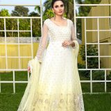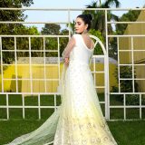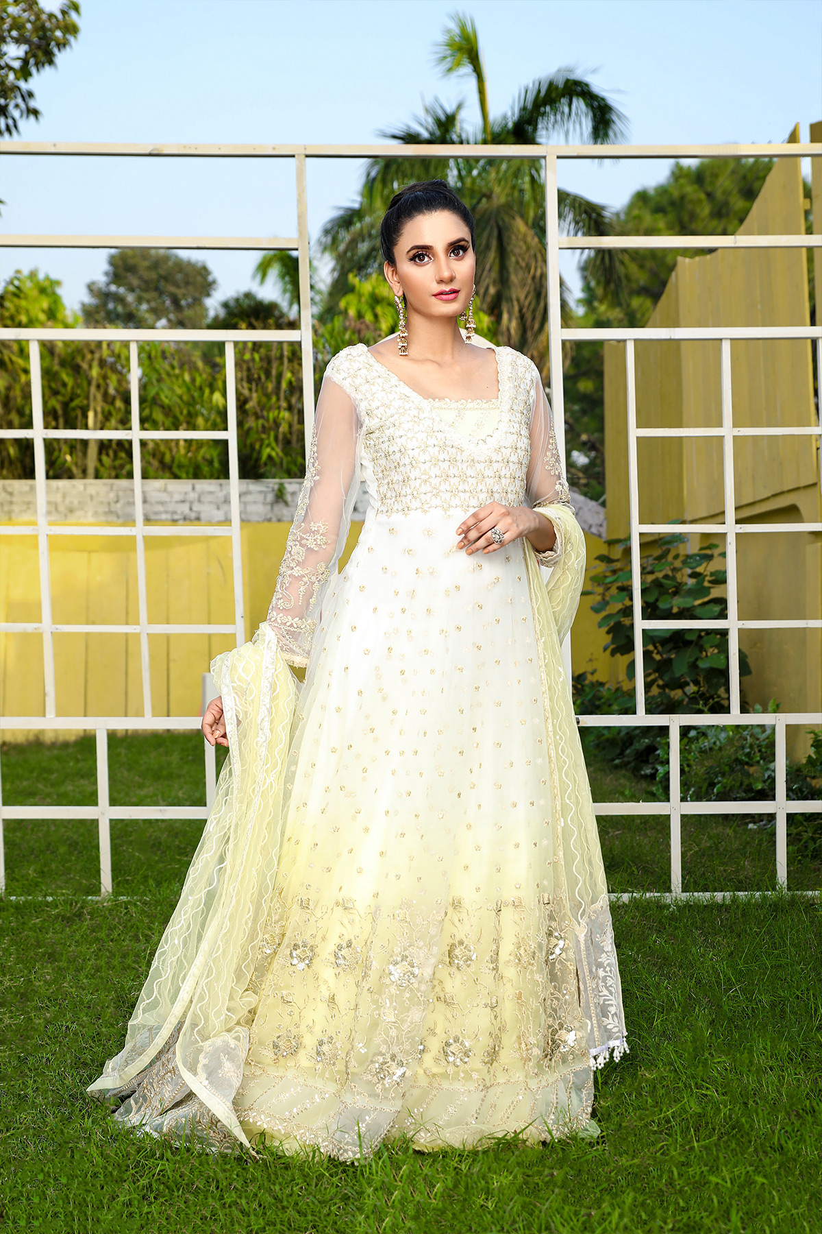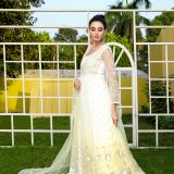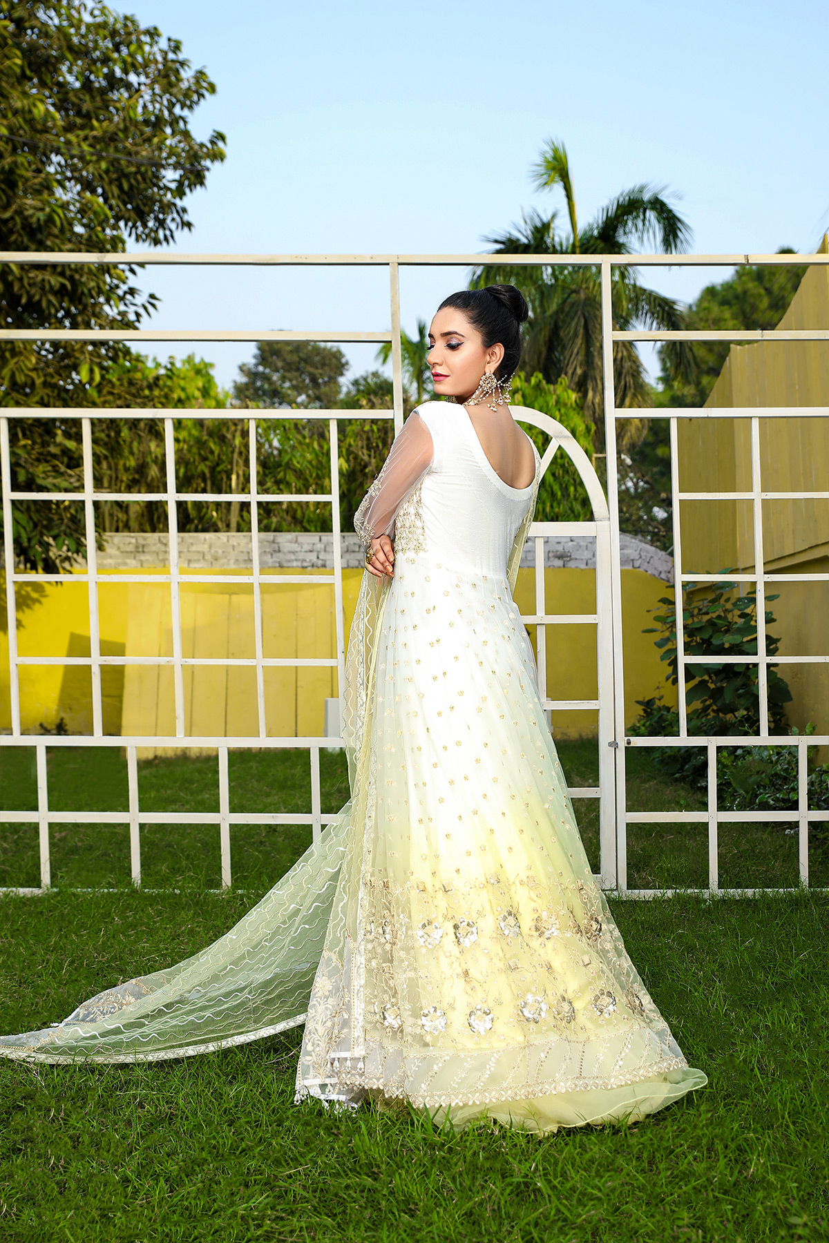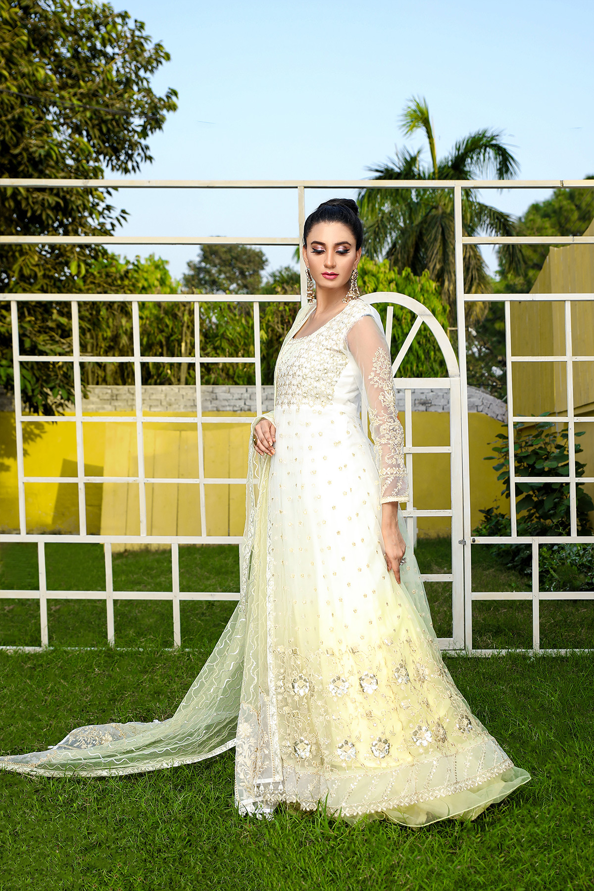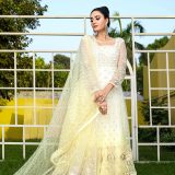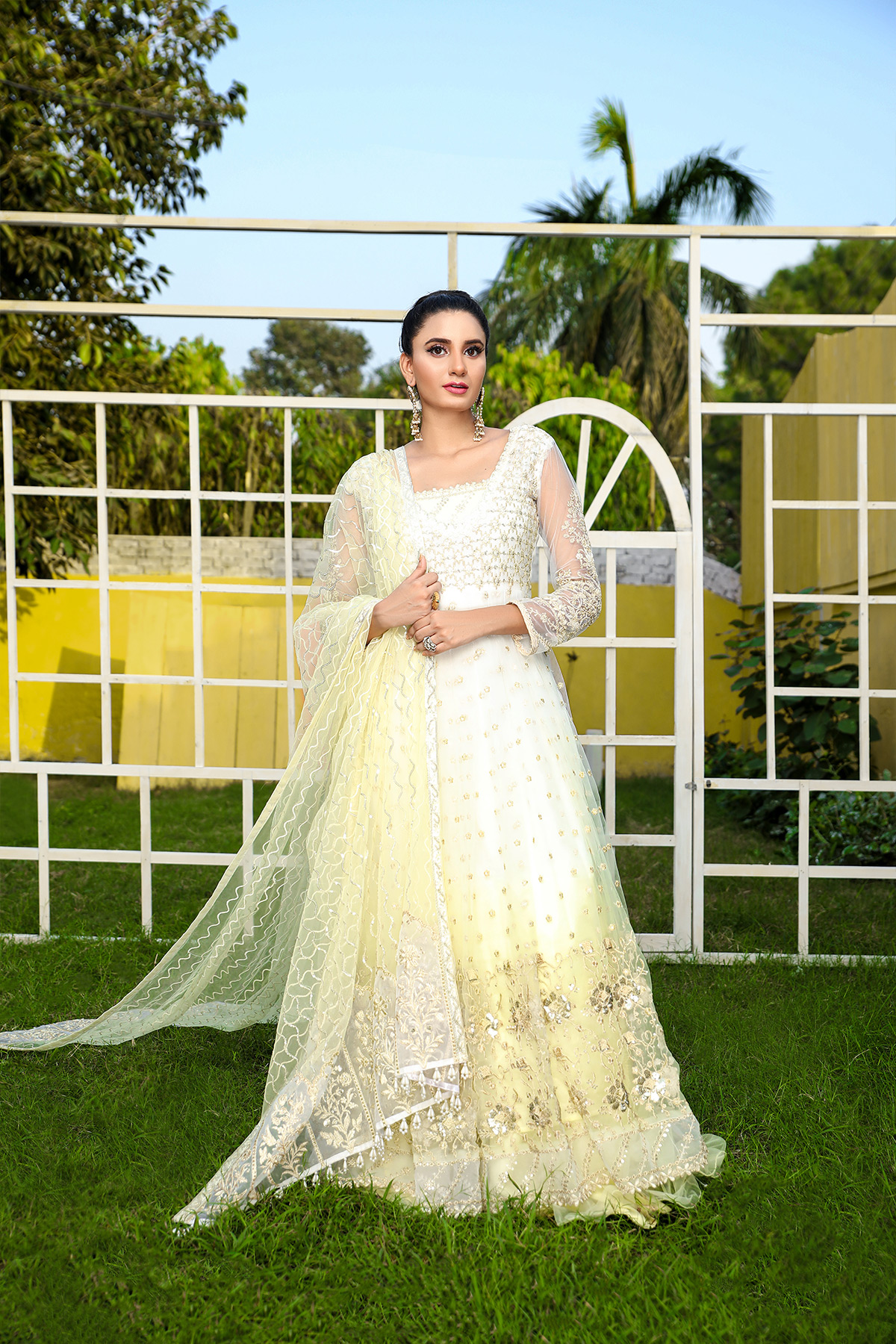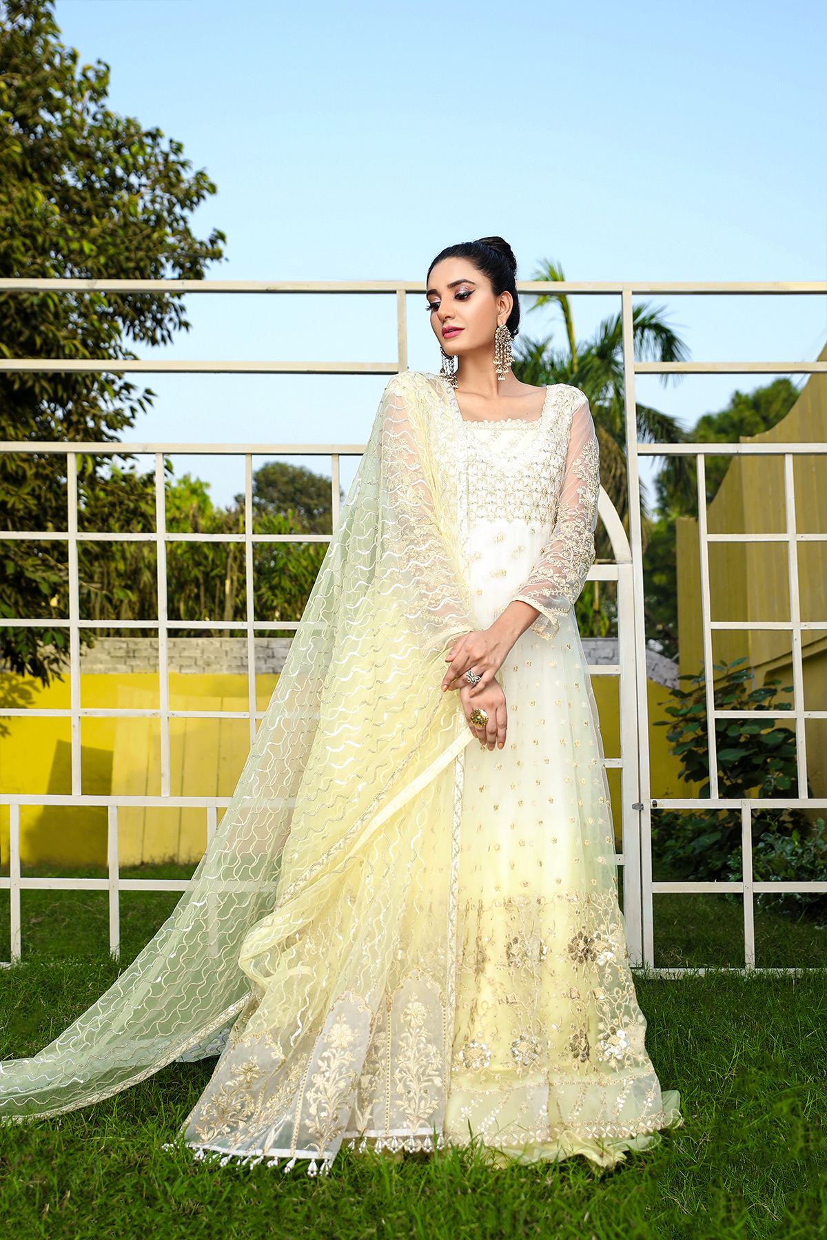 This gloriously lovely yellow pishwaas indulges you in a deep love affair with its unique color combination, sophisticated style and intricate details. Net fabric with fascinating details on front and back along with added excellence of delicate embroidery on borders of pishwaas and dupatta make it a perfect choice for weddings and party festive look. Fall in love with your own pretty appearance in this exquisite ensemble.